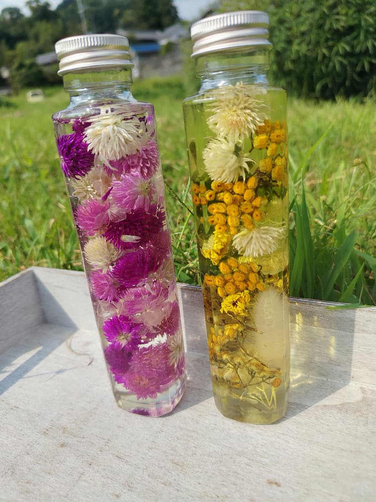 穂谷の里山で育った千日紅やハーブを使ったハーバリウムを作るワークショップです。