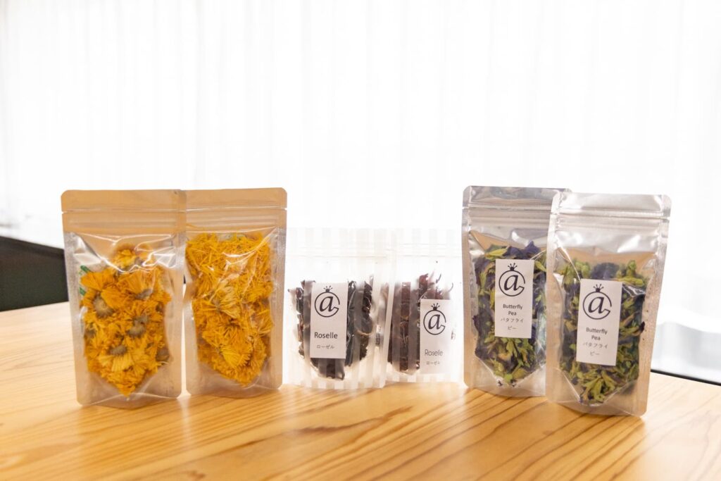 穂谷の阿部さんの畑で育った、3種類の植物から、鮮やかな3色のオリジナルドリンクが完成しました!