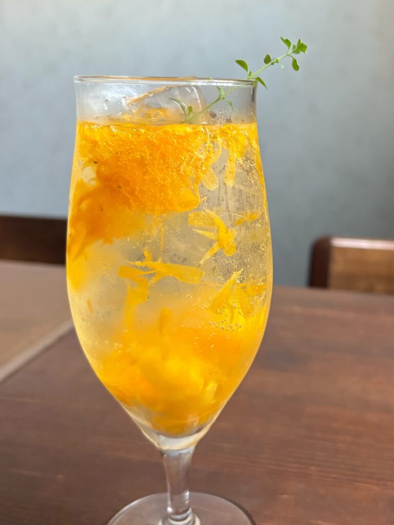 カレンデユラはキンセンカのこと。混ぜると花びらが舞う美しいドリンクです。