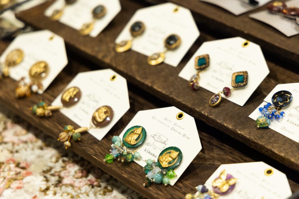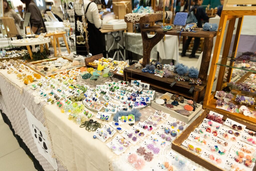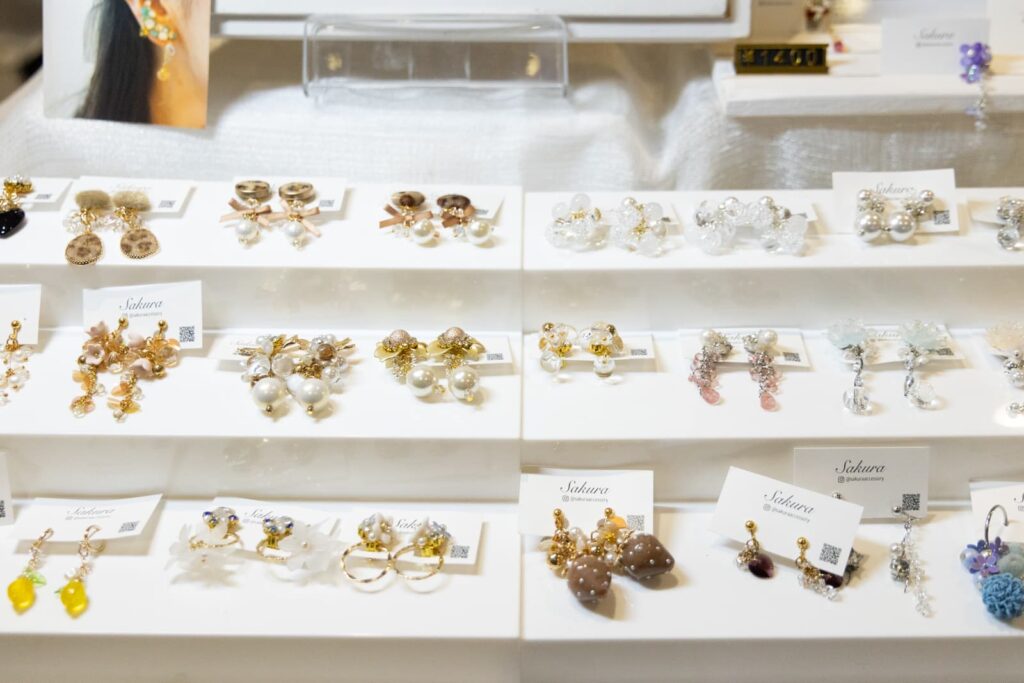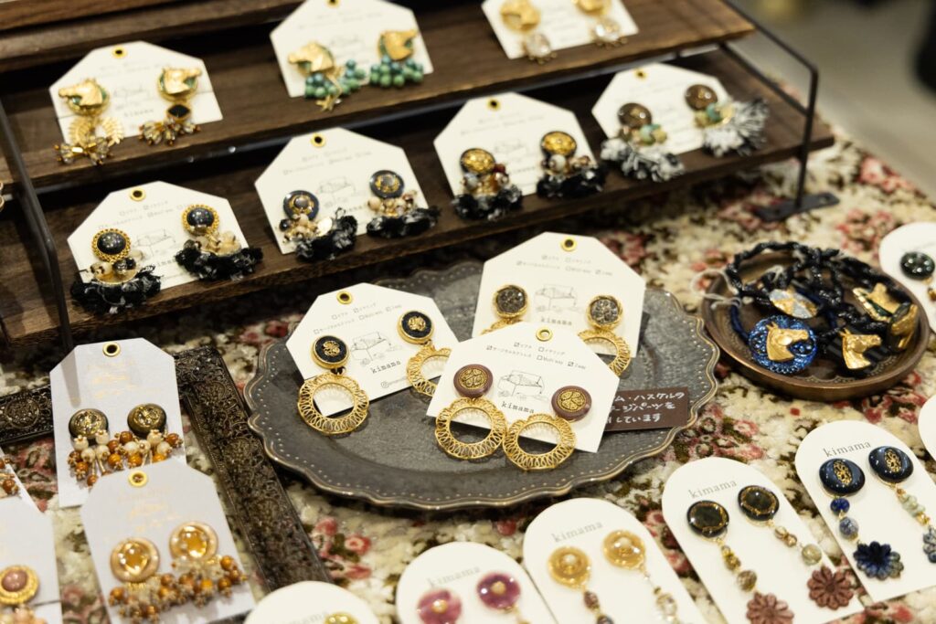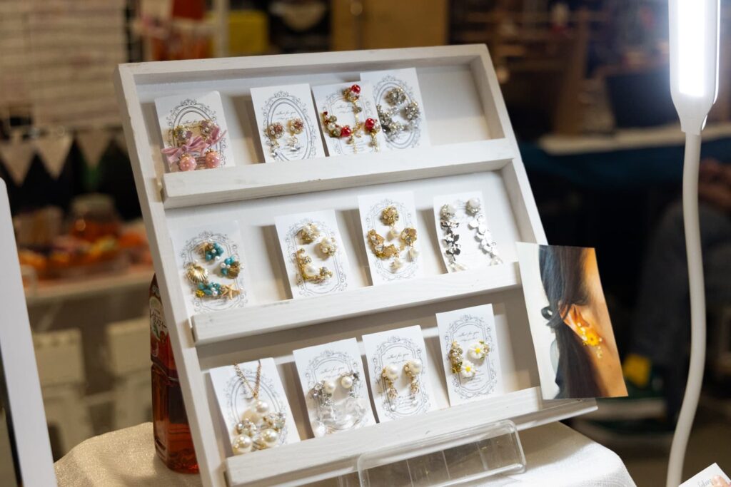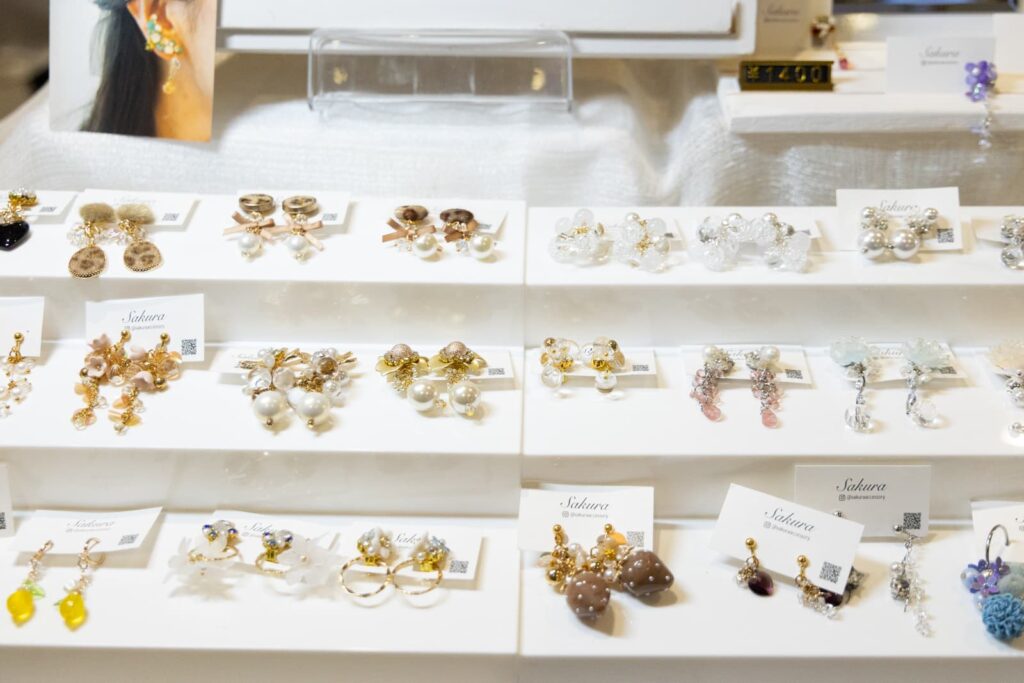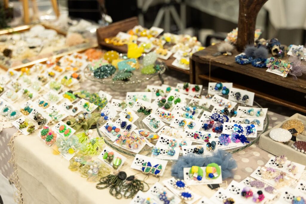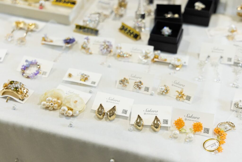 ビジューやフラワー等華やかなパーツを使って作成したハンドメイドアクセサリー