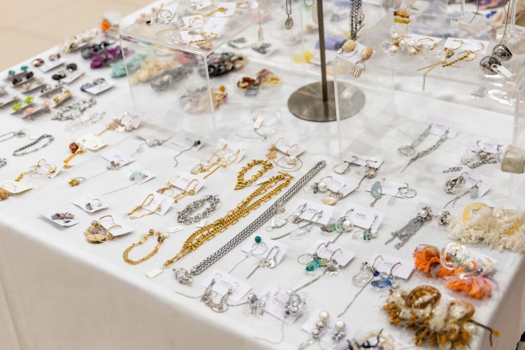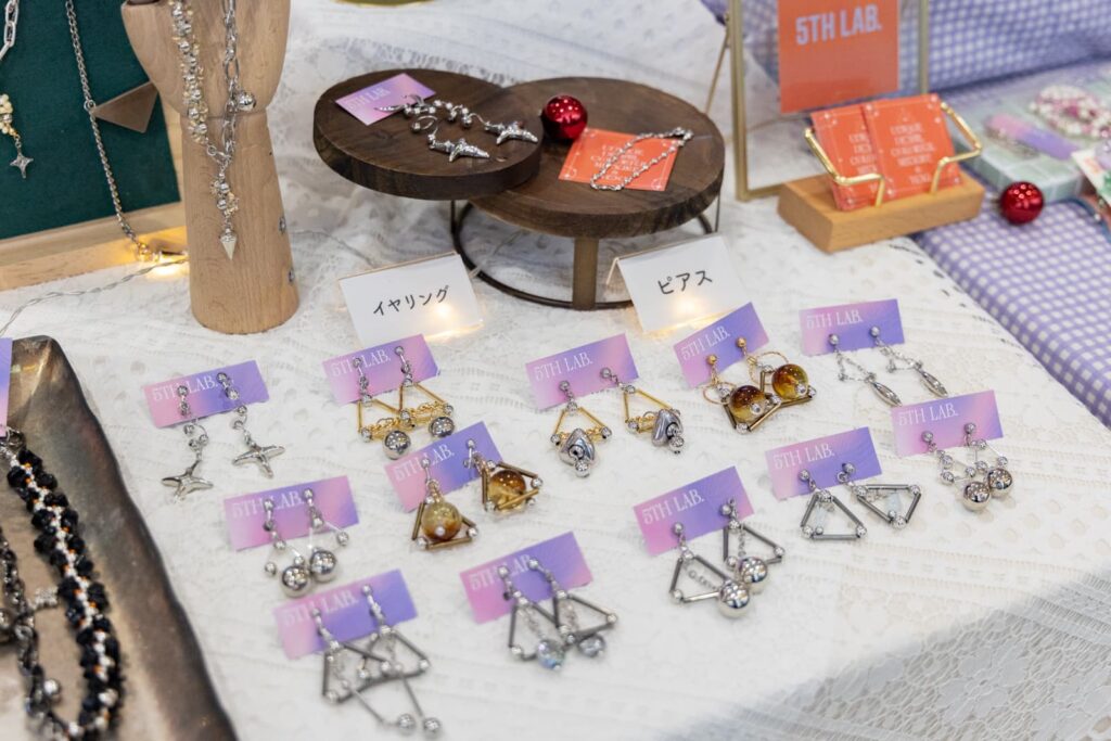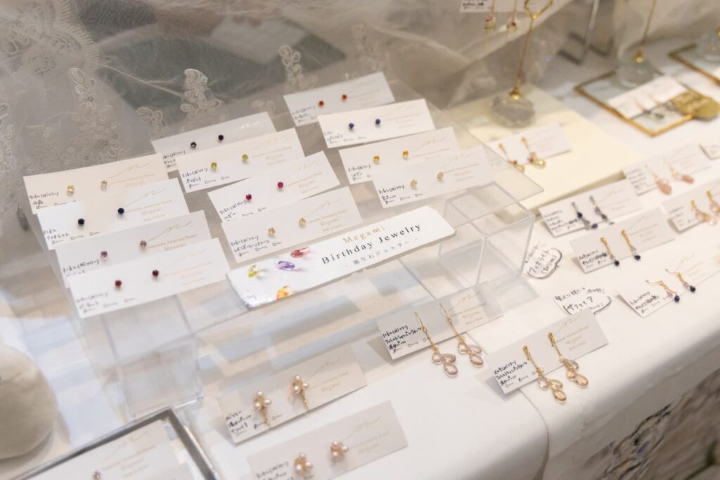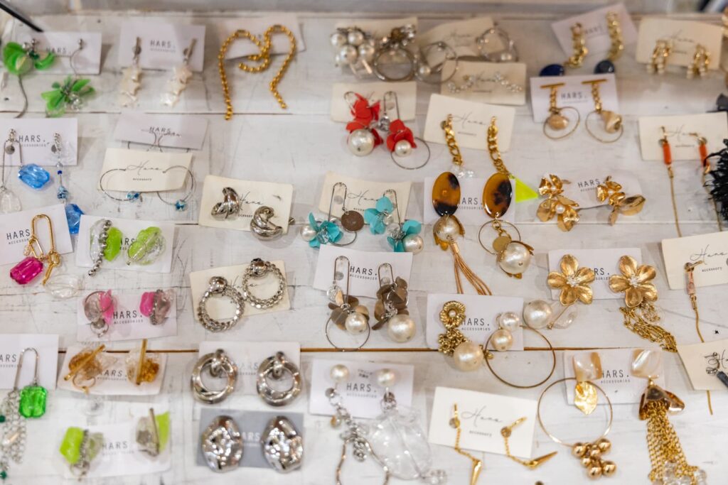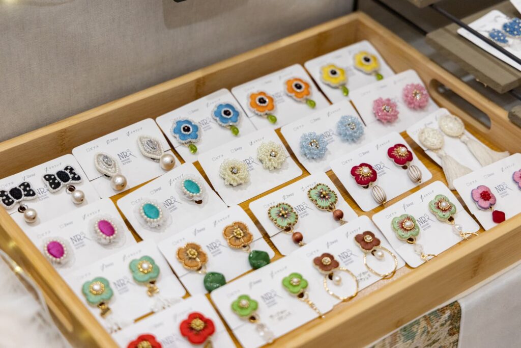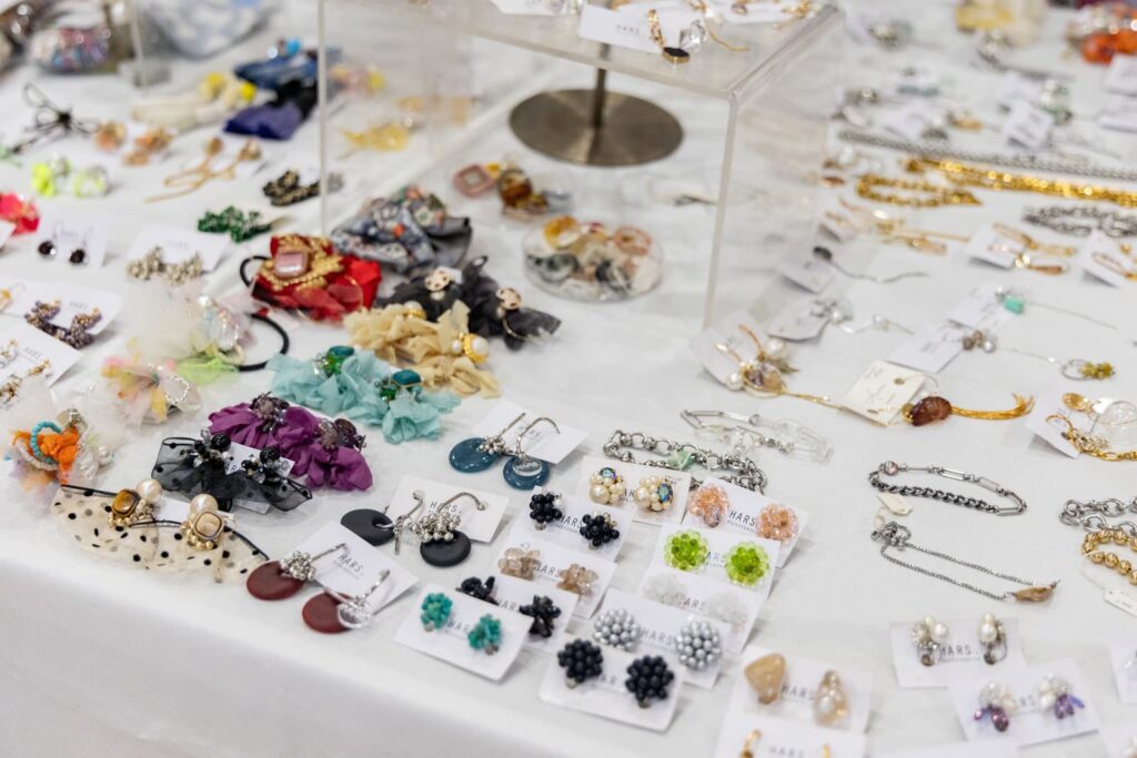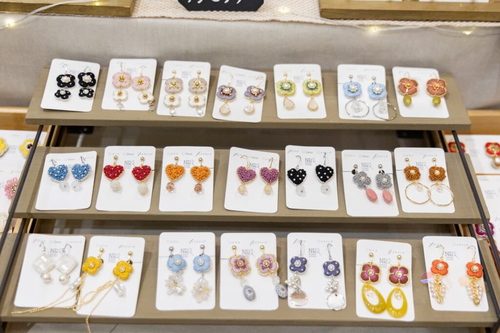 ビジューやフラワー等華やかなパーツを使って作成したハンドメイドアクセサリー