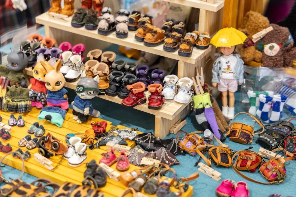 色々なドールやぬいぐるみなどの革小物やかぎ編み帽子を揃えてます