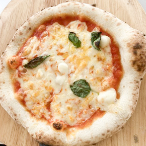 種類はマルゲリータ、大葉としらす、クワトロフォルマッジ、今日のピザです。その場で伸ばして、素早く焼きます。焼きたてのもちもちしたピザ、是非食べにきてください。