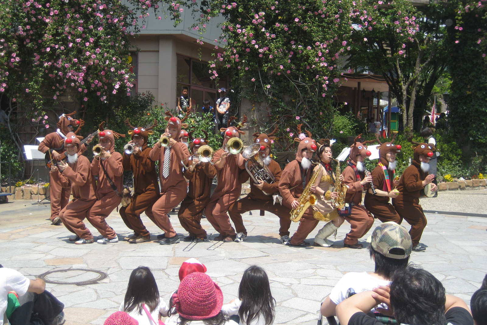 こんにちは。「ザ・トナカイズ」です。僕たちは、大学時代のクラブ仲間を中心に現在21名で構成している着ぐるみバンドです。名前の通り、一年中トナカイの全身コスチュームをまとって演奏しています。夏はとても暑くツライです。