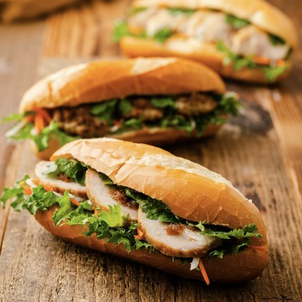 ベトナム人パン職人が焼いたサクッと歯切れが良いバインミーパンにたっぷりのローストビーフとフレッシュ野菜、なます、レバーパテ、パクチーが合わさり、甘辛酸の旨味溢れる贅沢なバインミーです。