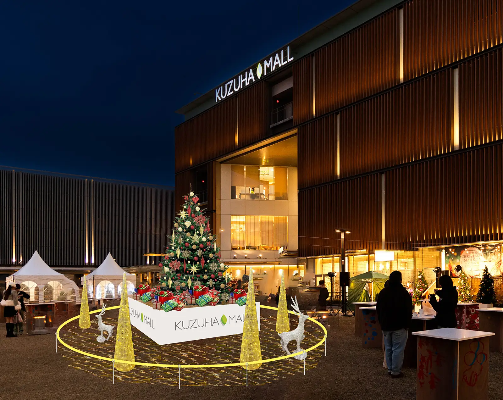 樟葉の駅前をあたたかな灯りのクリスマスツリーが照らします。